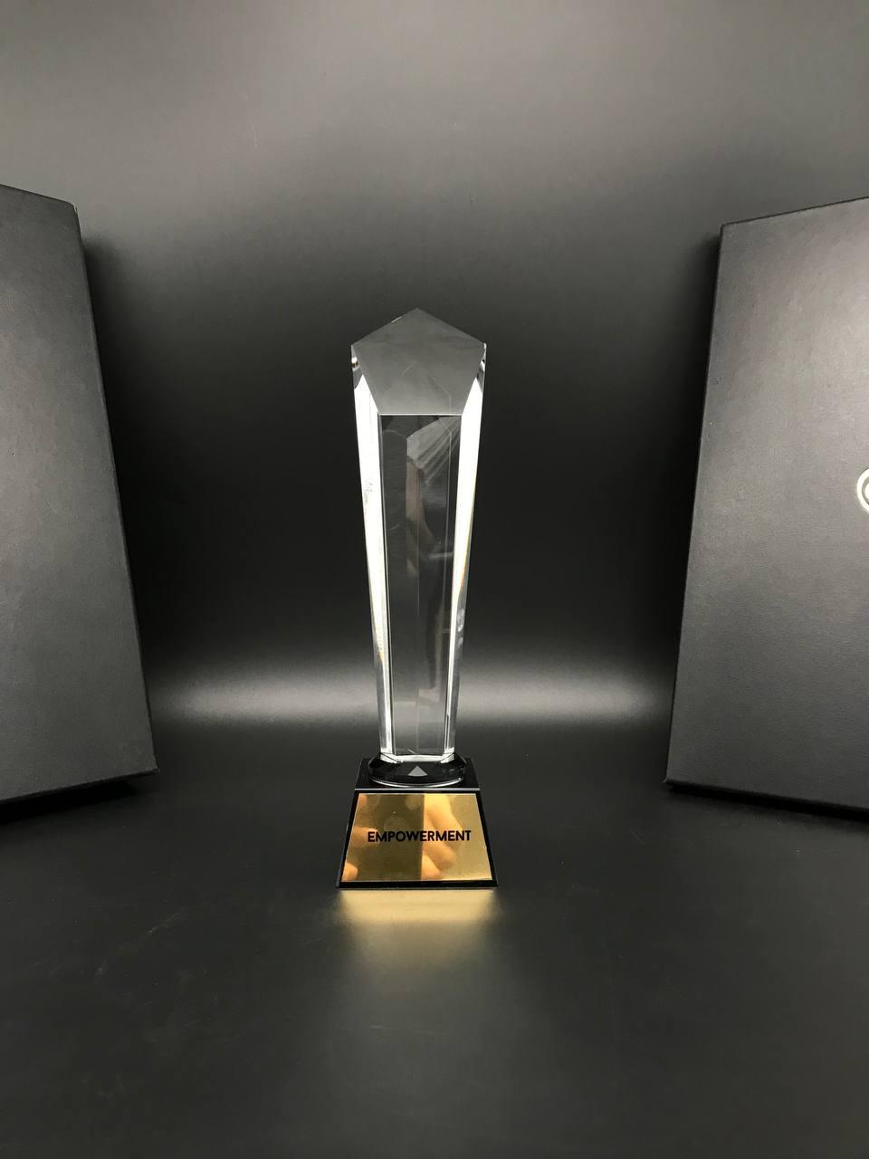 Высота-23 см. Материал-горный хрусталь. Статуэтка закрученная прозрачная. Есть возможность сделать верх и вниз метталическую табличку за отдельную стоимость.